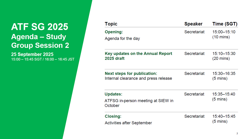 The 2nd Study Group Session of ATF SG 2025 was held on 25 September 2025 and primarily focused on reviewing and discussing the draft content of the 2025 Annual Report. The session provided members with an opportunity to reflect on the structure, analytical framing, and key messages of the report before finalization.